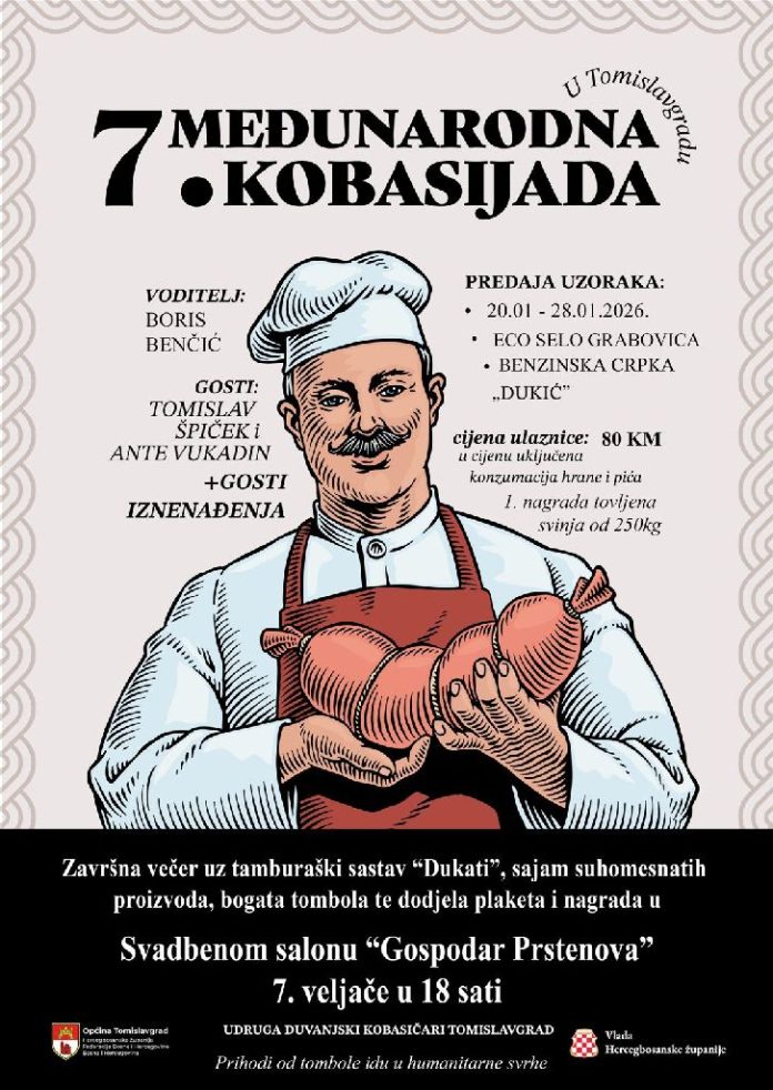 Udruga “Duvanjski kobasičari” Tomislavgrad obavještava javnost da će se 7. međunarodna kobasijada u Tomislavgradu održati 7. veljače u restoranu Gospodar