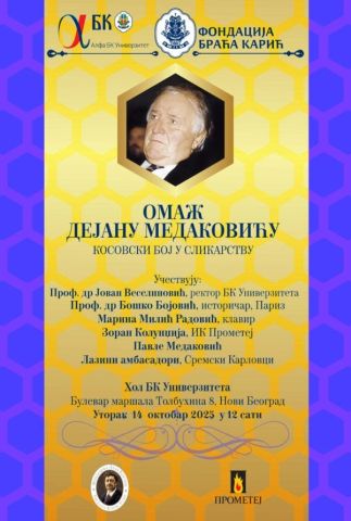 U posebno upriličenom programu pod nazivom “Omaž Dejanu Medakoviću“, Fondacija Braća Karić, izdavačka kuća “Prometej“ i Fondacija “Laza Kostić“ će odati