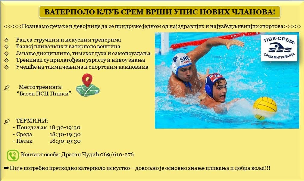Sremska Mitrovica – Vaterpolo klub Srem započeo je upis novih članova i poziva dečake i devojčice da se uključe u jedan od najzdravijih i najzahtevnijih