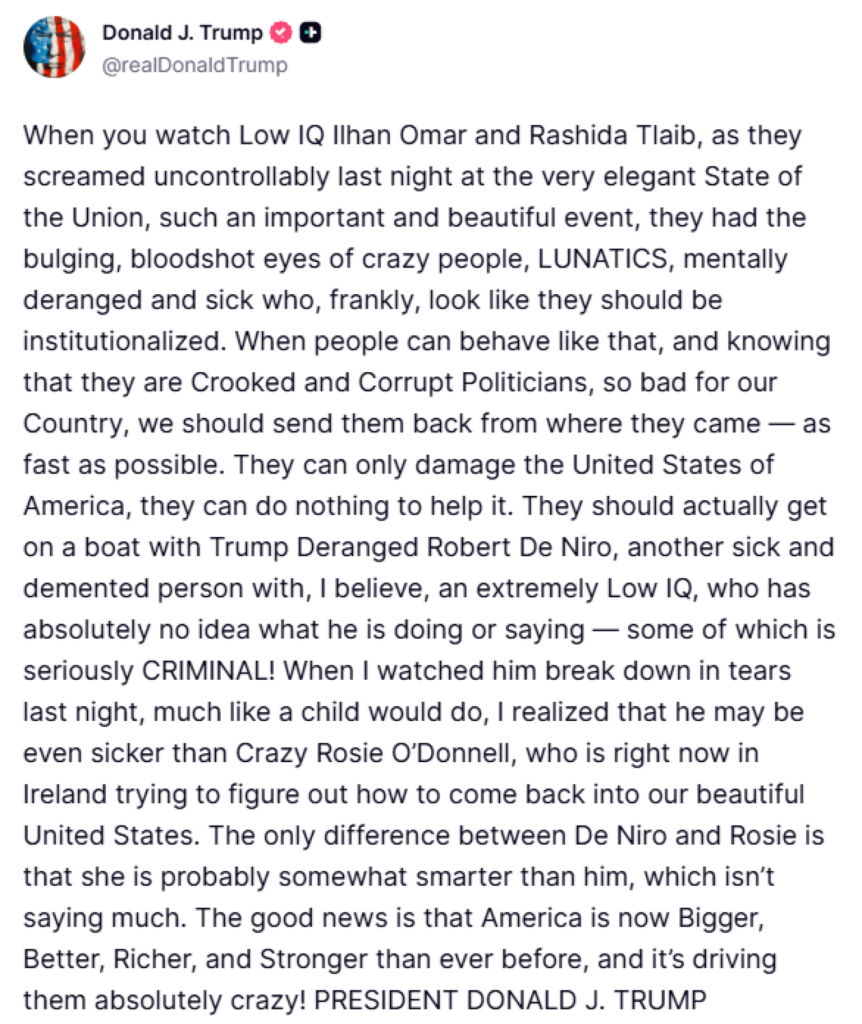 Σφοδρή πολιτική αντιπαράθεση ξέσπασε στις Ηνωμένες Πολιτείες μετά την ομιλία του Ντόναλντ Τραμπ για την Κατάσταση του Έθνους, όταν οι γυναίκες βουλευτές