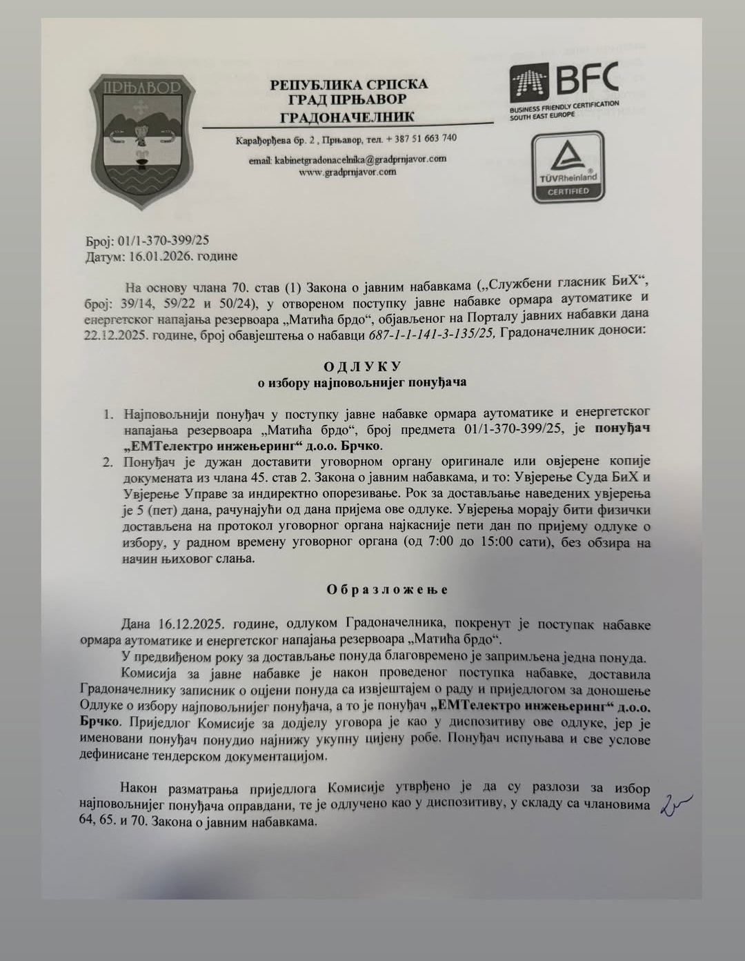 Gradonačelnik Prnjavora donio je odluku o izboru najpovoljnijeg ponuđača za postupak javne nabavke ormara automatike i energetskog napajanja za rezervoar