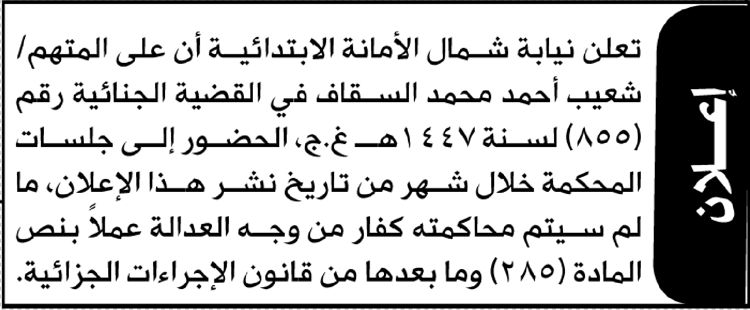 تعلن محكمة شمال الأمانة بأن على/ شعيب أحمد السقاف الحضور إلى المحكمة
