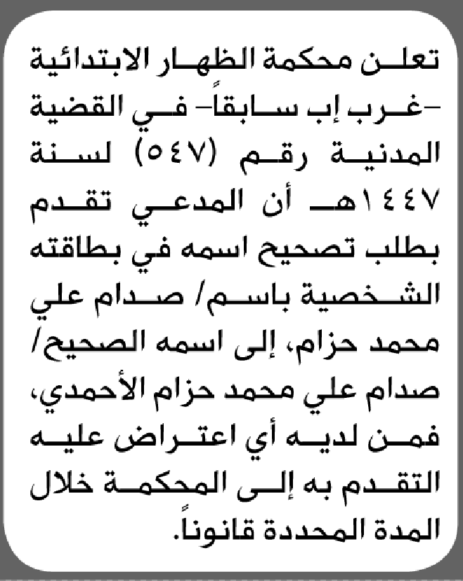 تعلن محكمة الظهار الابتدائية بأن الأخ/ صدام علي حزام تقدم إليها بطلب تصحيح اسمه