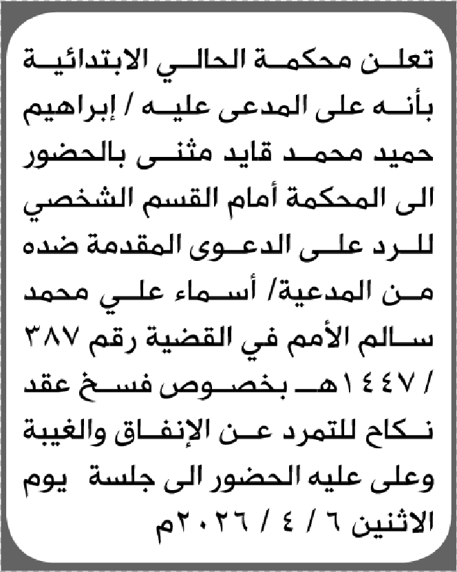 تعلن محكمة الحالي الابتدائية بأن على/ إبراهيم حميد مثنى الحضور إلى المحكمة