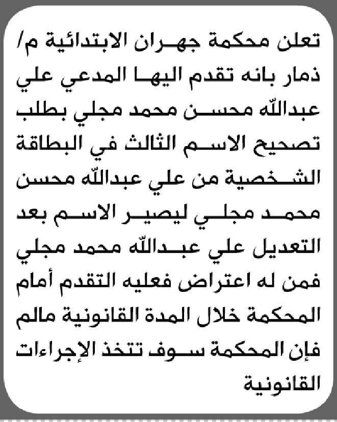 تعلن محكمة جهران الابتدائية بأن الأخ/ علي عبدالله مجلي تقدم إليها بطلب تصحيح اسمه