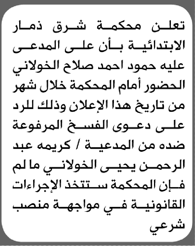 تعلن محكمة شرق ذمار الابتدائية بأن على/ حمود أحمد الخولاني الحضور إلى المحكمة