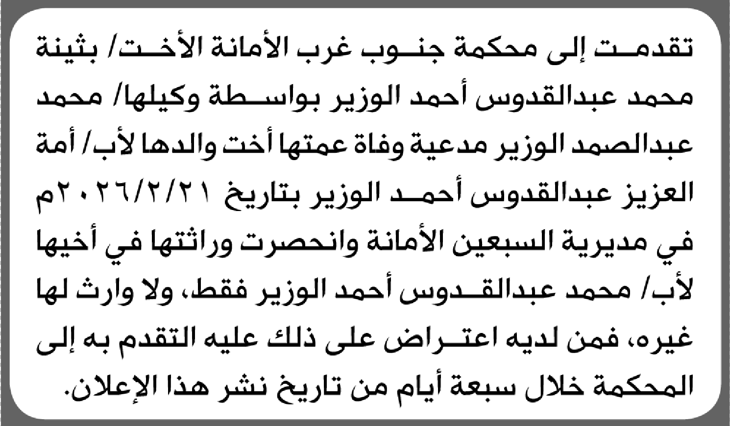 تعلن محكمة جنوب غرب الأمانة بأن الأخت/ بثينة محمد الوزير تقدمت إليها بطلب انحصار وراثة