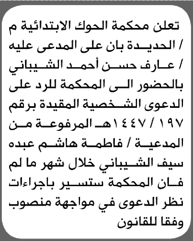 تعلن محكمة الحوك الابتدائية بأن على/ عارف حسن الشيباني الحضور إلى المحكمة