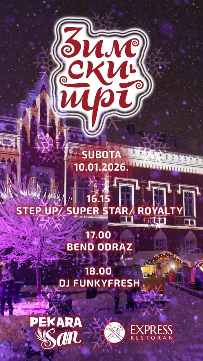 Zimski trg i danas donosi bogat program za sve generacije. Od 16.15 časova počeće hepening na bini uz ples i igru studija Royalty, Super Star i Step Up.