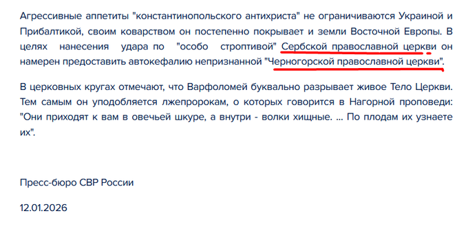 Руска спољно-обавештајна служба у саопштењу наводи да цариградски патријарх Вартоломеј, да би задао ударац Српској православној цркви, намерава да додели