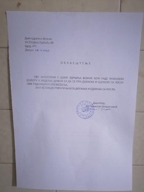 S kojim razlogom medicinsko i nemedicinsko osoblje Doma zdravlja u Bojniku, koje dežura vikendom, pri dolasku na posao i završetku smene „mora da se javi“